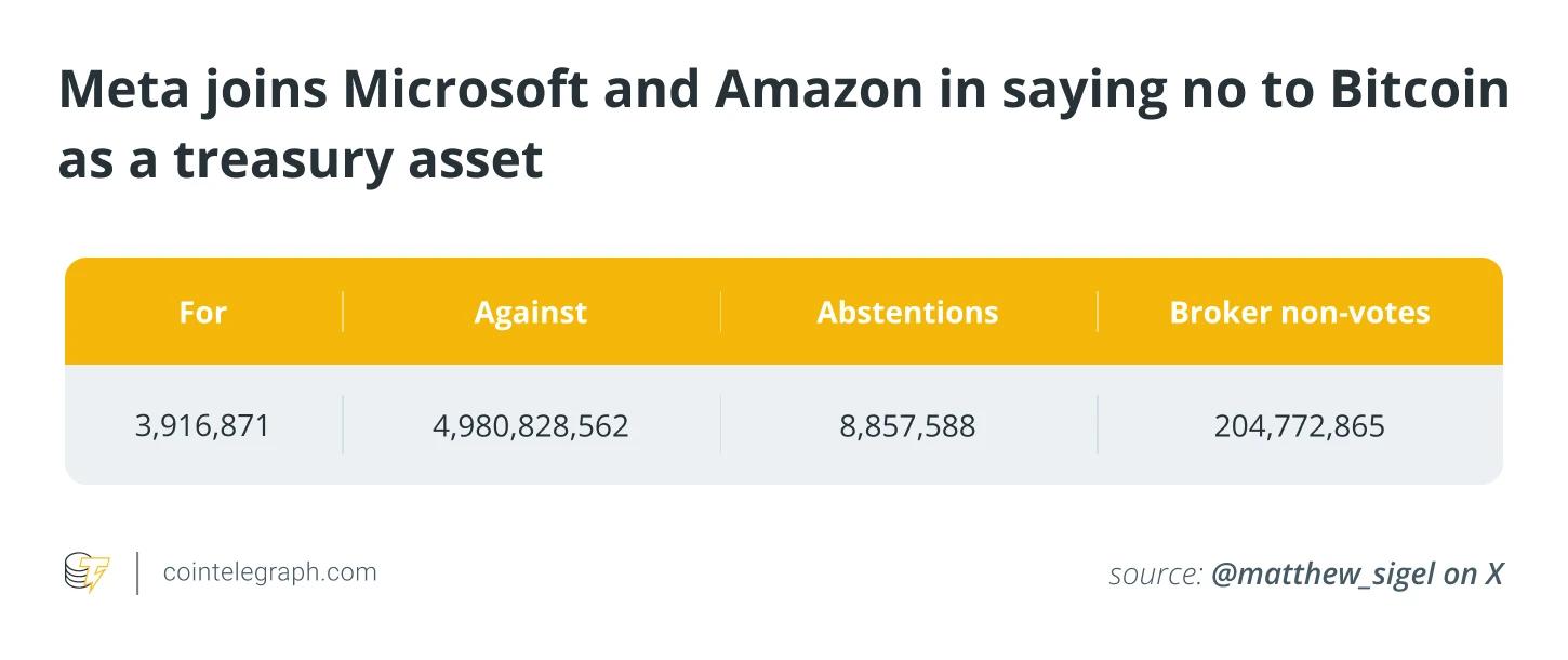 微软、亚马逊和 Meta 的股东均已明确否决了设立战略性比特币储备的提案。在 Meta 2025 年年度股东大会上,股东对设立比特币储备表达出强烈反对,超过 90% 的股东投票反对该提案。该提案建议 Meta 考虑将其 720 亿美元现金储备的一部分转换为比特币,以下是本次投票的结果:
