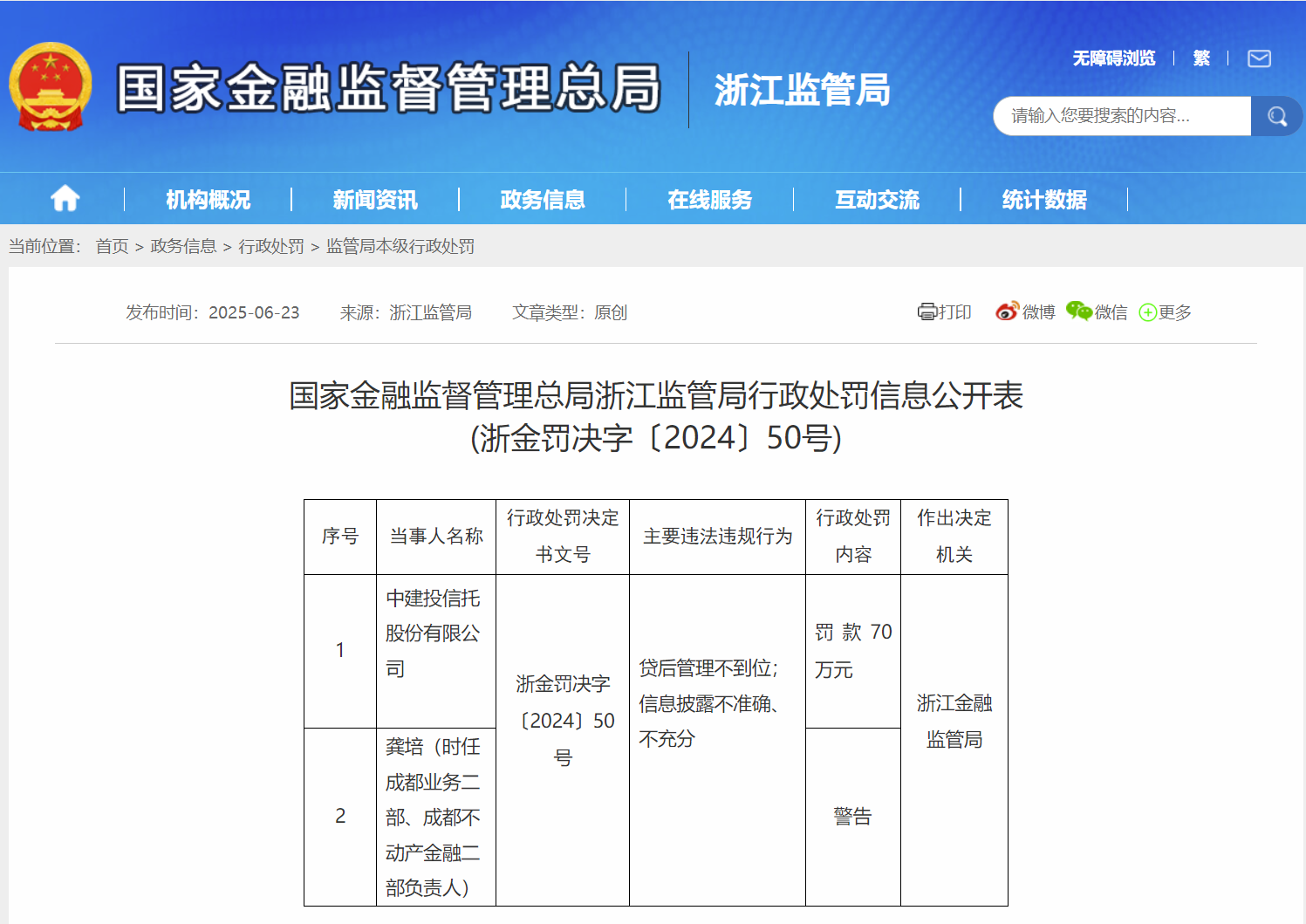 2025 年 6 月 23 日,国家金融监督管理总局浙江监管局披露行政处罚信息,中建投信托因 “贷后管理不到位、信息披露不准确不充分” 被处以 70 万元罚款,时任成都业务部门负责人龚培被警告。这一处罚揭示了这家信托公司在风控与合规层面的漏洞,而同期披露的 2024 年年报则显示其经营状况已陷入更深困境 —— 全年净利润亏损 13.9 亿元,较 2023 年扩大 257%,不良资产率高企至 26%,房地产信托业务成为风险重灾区。